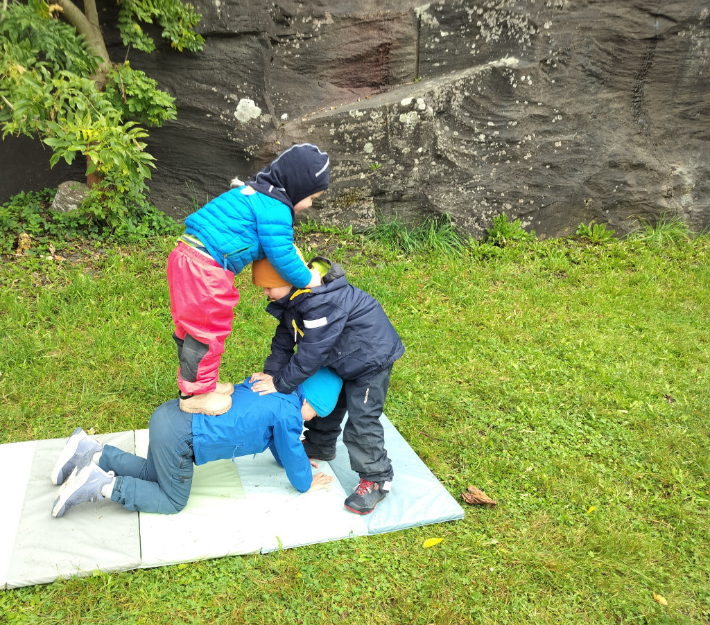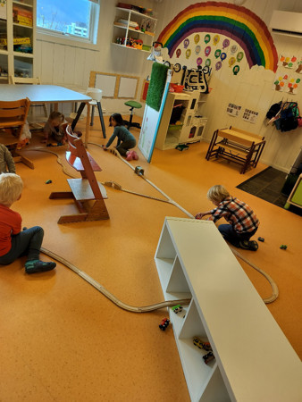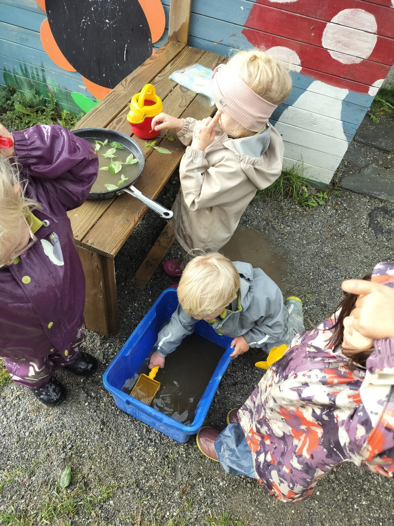 Uteleik i leikehuset, full fart med fysisk aktivitet og leik med vatn og sand er veldig kjekt. Ein dag i veka er heile barnehagen på tur i nærområdet.